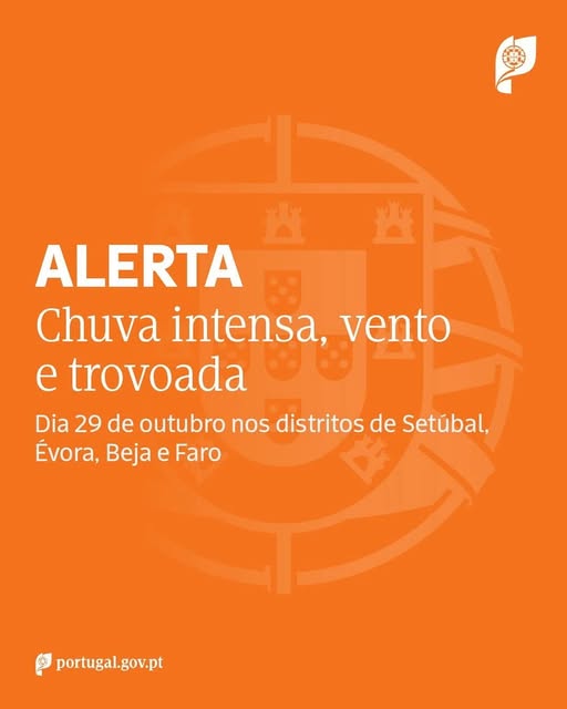O IPMA colocou os distritos de Setúbal, Évora, Beja e Faro sob aviso laranja devido à chuva forte, além de trovoadas e vento. O aviso está em vigor desde as 03h do dia 29 e dura até às 15h do mesmo dia.